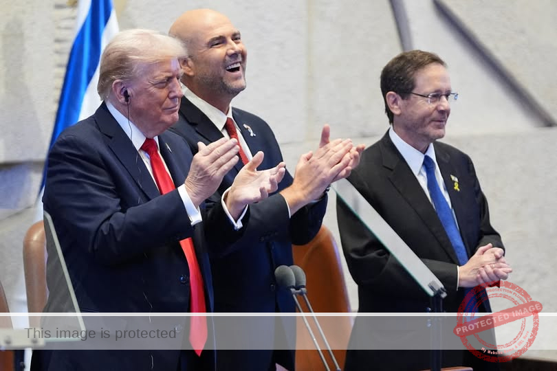President Donald Trump arrives with Speaker Amir Ohana and Israel's President Isaac Herzog to speak to the Knesset, Monday, Oct. 13, 2025, in Jerusalem. Evan Vucci/Pool via REUTERS