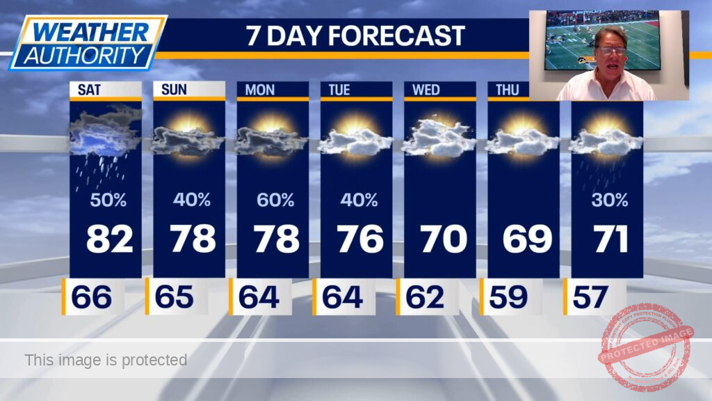 Rain chances will persist through the week. Sunday brings a 40% chance of scattered showers and storms, mainly midday and afternoon, with highs in the 70s. Showers and thunderstorms remain possible Monday and Tuesday, while Wednesday and Thursday are expected to be partly cloudy with isolated showers and highs in the upper 60s to around 70.