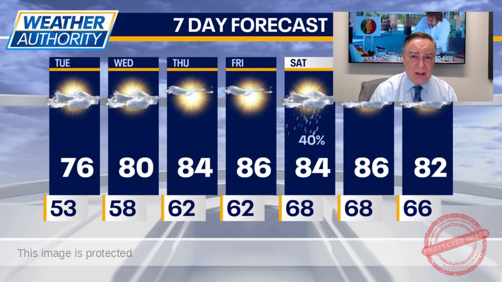 Upper 80s are possible Sunday and Monday with mostly sunny skies.