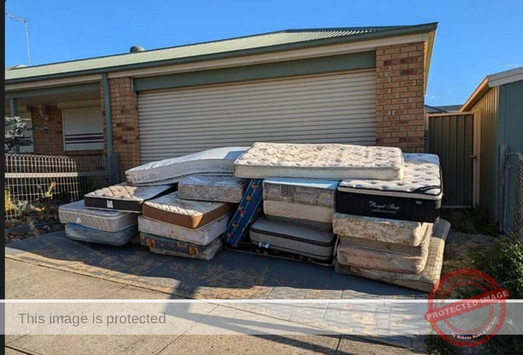 Laura and Jarrod Maultby, from Langwarrin, Melbourne, had 26 filthy mattresses dumped on their driveway after posting a bad online review for trash collection company “Junk.”