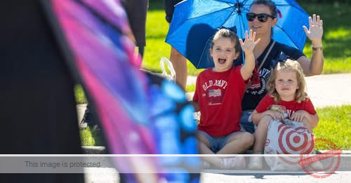 A Fire Department delegation followed, splashing water out of red buckets onto the crowd lining the sidewalk in a miles-long line of lawn chairs and yard parties. Behind them came a high school band, a dance troupe and yet another fire truck, this time with its occupants tossing candy.