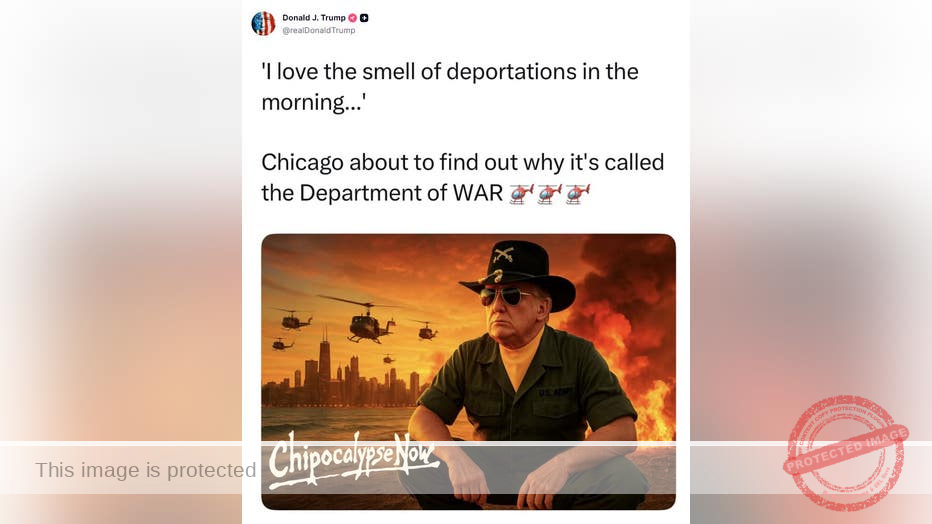CHICAGO – President Donald Trump on Saturday morning appeared to threaten the City of Chicago with deportations on a post on Truth Social in which he used an AI-generated parody of a war movie.