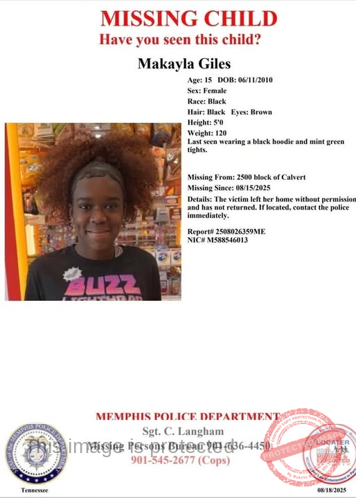 The Memphis Police Department is urgently seeking assistance in locating Makayla Giles, a 15-year-old girl who went missing from her home on August 15, 2025, in the 2500 Block of Calvert in Memphis, Tennessee. Makayla has not returned home, and her family and authorities are deeply concerned for her safety and well-being.