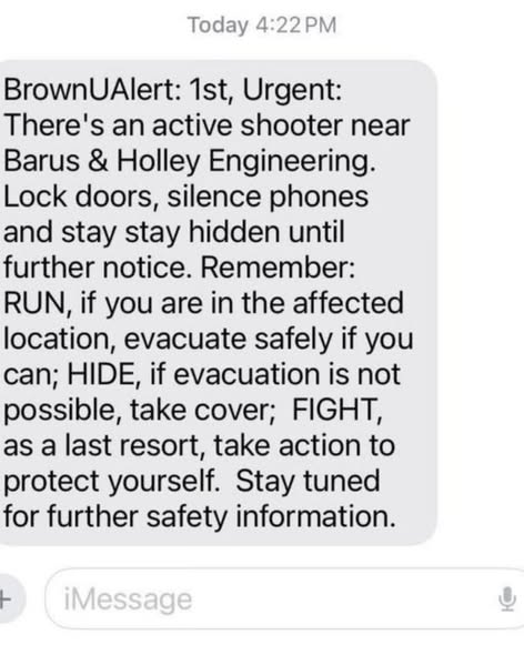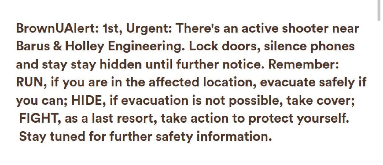 The first BrownUAlert was stark and urgent: “There’s an active shooter near Barus & Holley Engineering. Lock doors, silence phones and stay hidden until further notice.” It reminded everyone of the now-familiar guidance of Run, Hide, Fight — urging those in danger to flee if possible, hide if not, and only fight as a last resort. That message set the tone for what would become hours of uncertainty for a campus community already stressed by the end-of-semester environment.